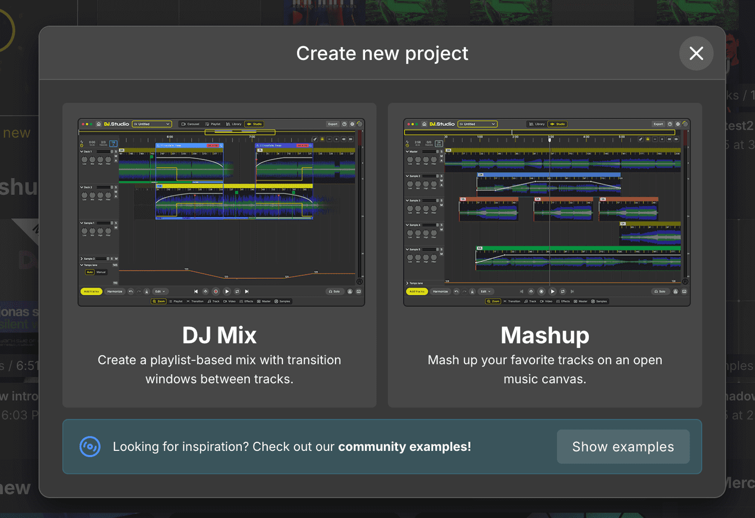 Click the Home icon to open the Mix Dashboard, then choose "Create new mix". Pick DJ mix to build a continuous set with back-to-back transitions, or Mashup if you want a free canvas for more experimental edits.
