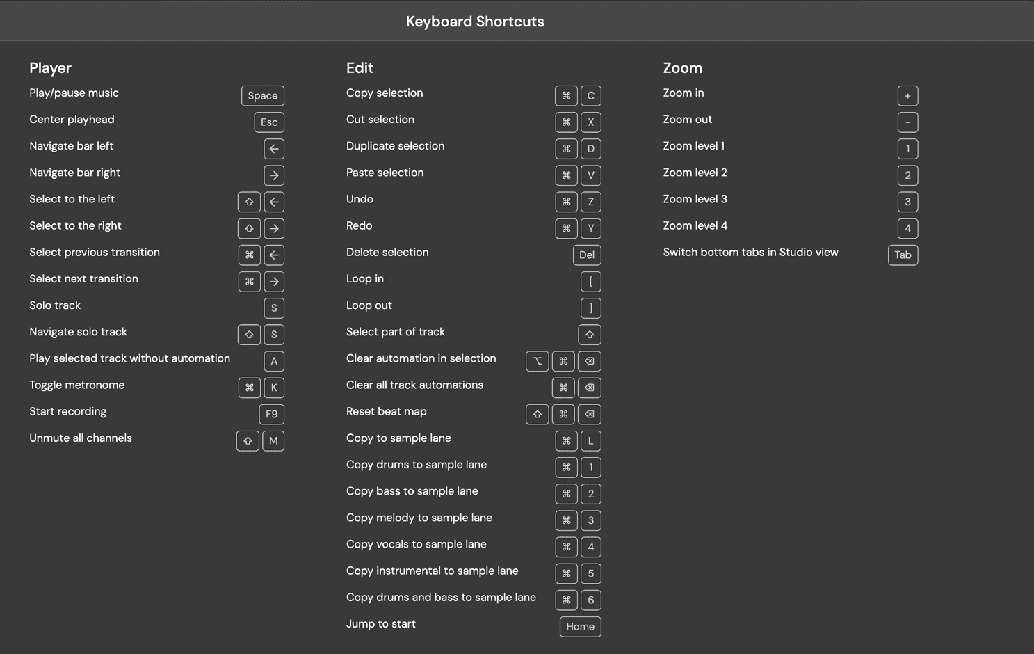 You can speed up your mixing process by using keyboard shortcuts. You can find the explanation of all of the shortcuts in the middle bar at the right side of your Studio.