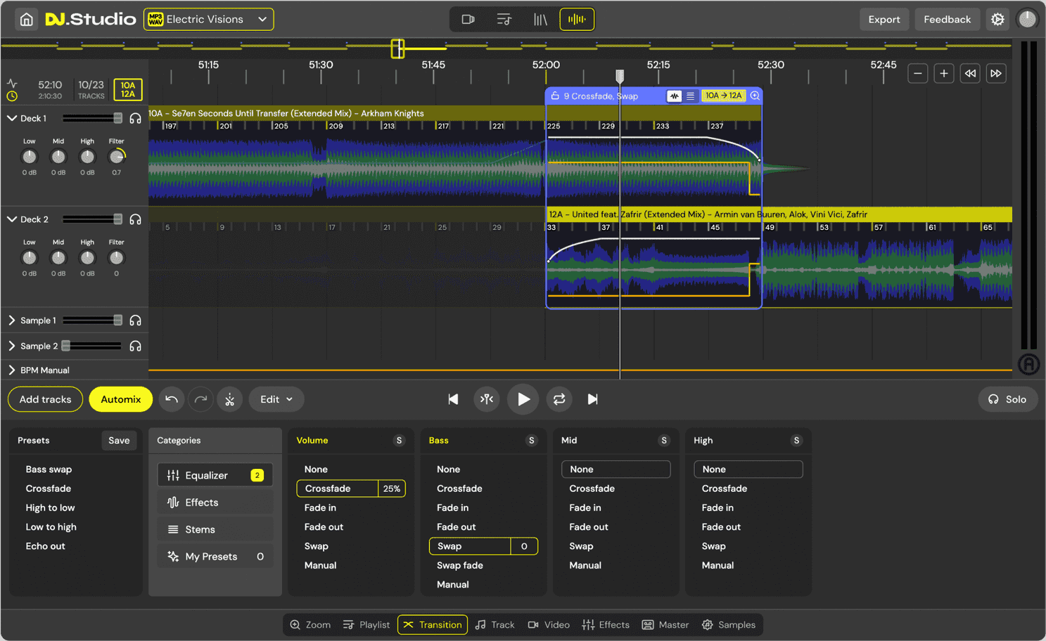 Open the Transition Editor to place mixes on intros/outros, then use automation for EQs, filters, and volume rides to create a balanced mix. This is also where you place sweepers on beats and align stingers.