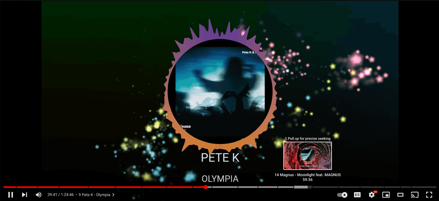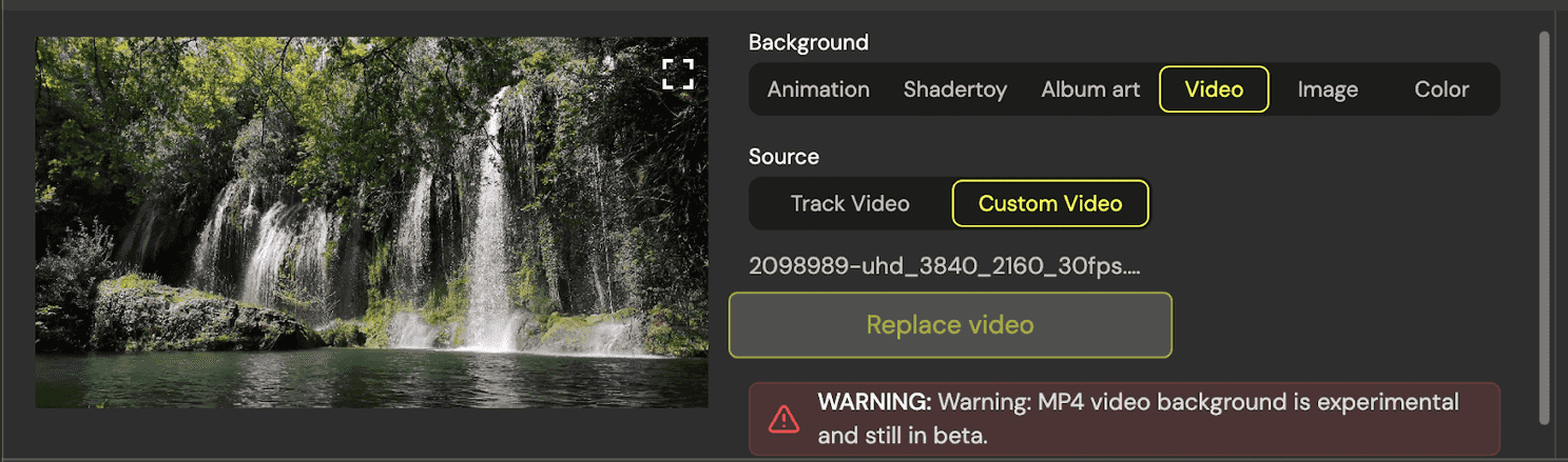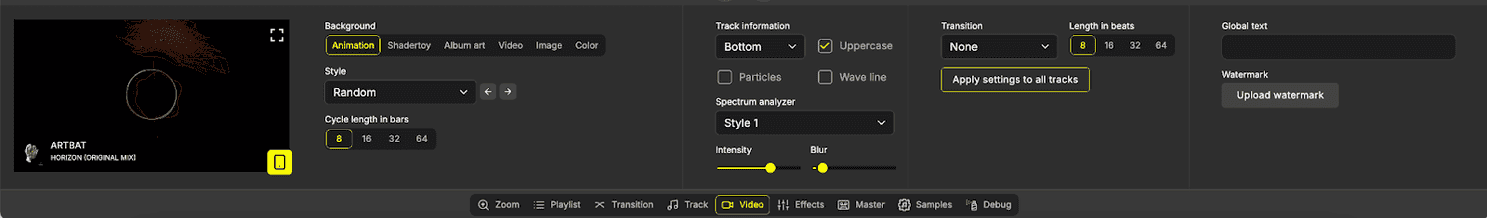 With the audio locked, I switch to the Video tab. This is the fun part of the creative process. For each track, I choose a background - this could be one of many animations, a static image, album art, or even wild GPU-shader visuals using Shadertoys.