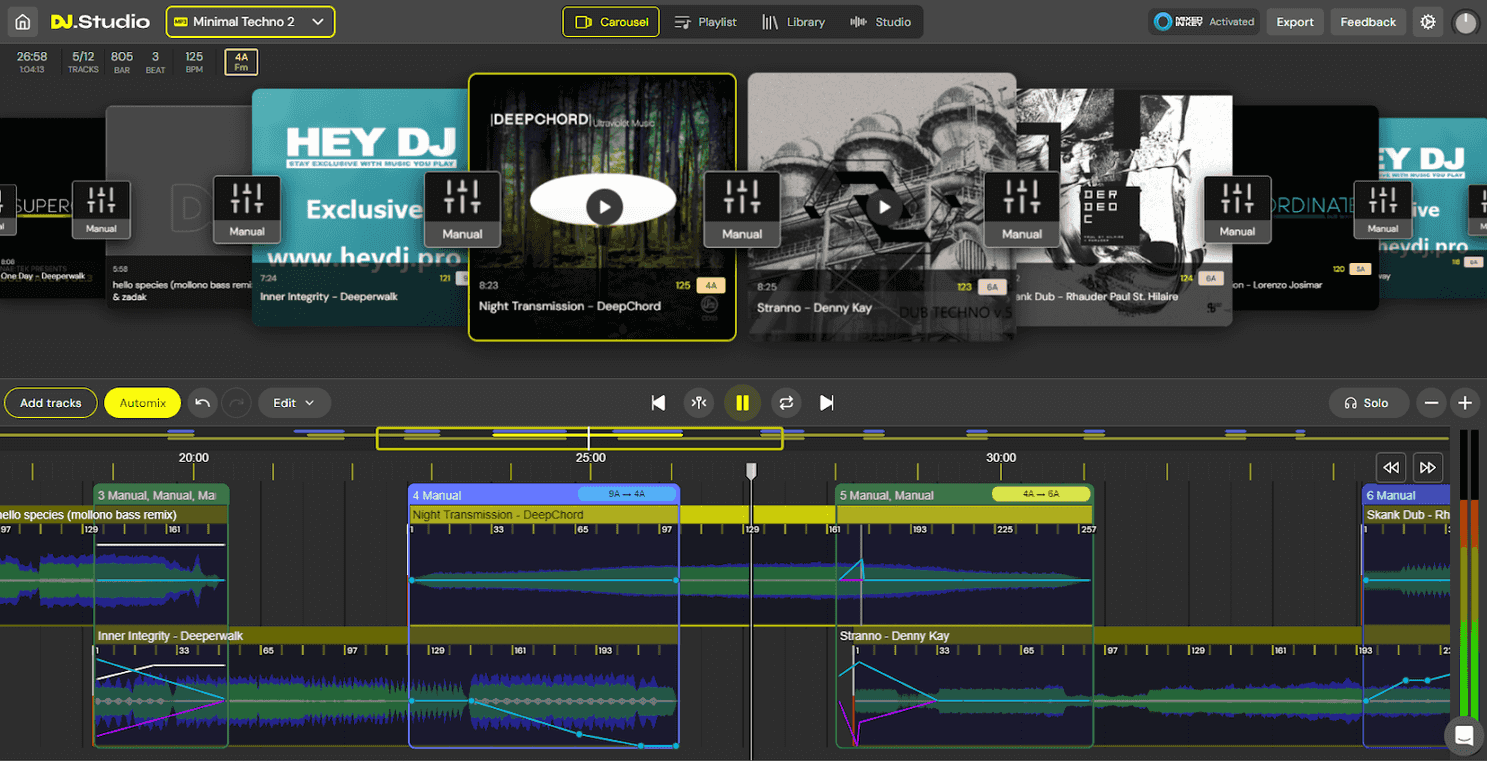 Using the auto-mix function in DJ.Studio, the algorithm quickly selects the best combinations from up to 10 million possibilities. I typically adjust about 25-30% of the list to fit the structure of my show. Due to my preset transition settings, the mix is half-finished at this point. I then refine the transitions. DJ.Studio offers many useful features, such as key synchronization for tracks in different keys and the ability to mimic professional Pioneer DJ equipment.