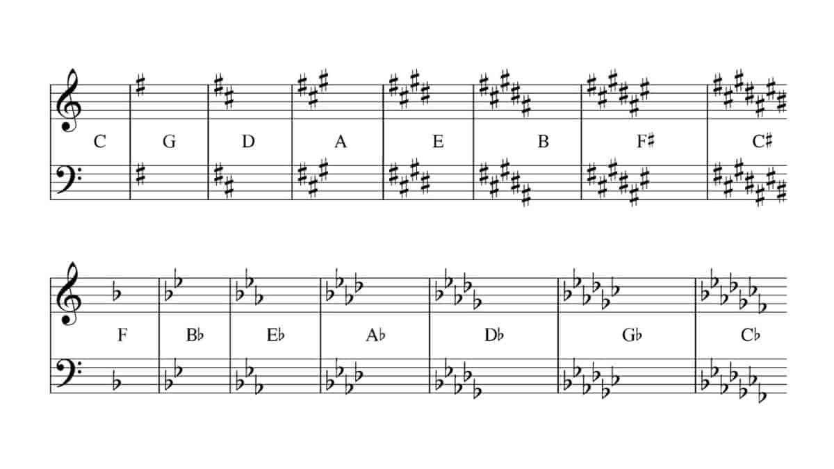 The key signature of a song is shown by the number of sharps and flats on the lines and spaces of the music staff - which also indicates if it's a major or minor key.
