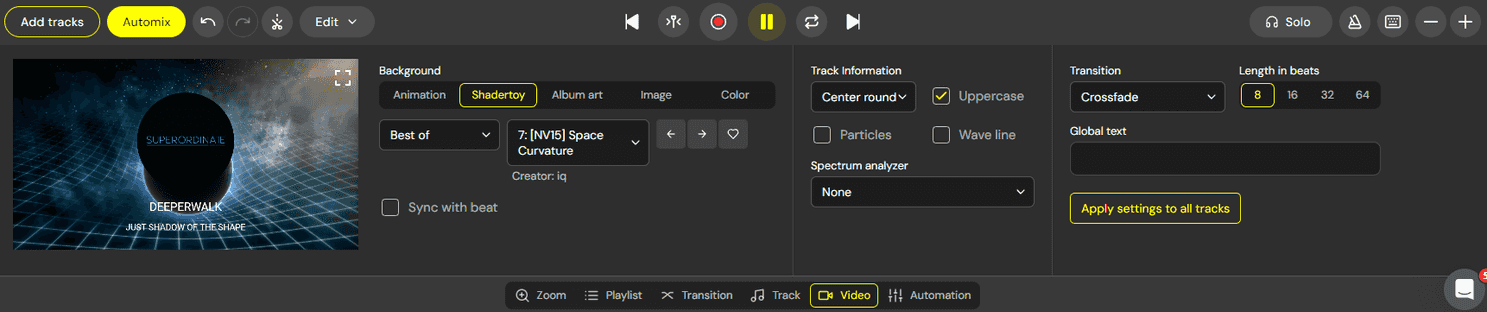 YouTube Video - DJ.Studio can create fully audio-reactive videos to accompany your mixes. Using animations from Shadertoy, you have over 30000 unique visual scenes to enhance your mix with - the perfect promo tool! You can also export the tracklist and timestamp info as text to paste into your YouTube description, instantly creating chapter dividers for each song.