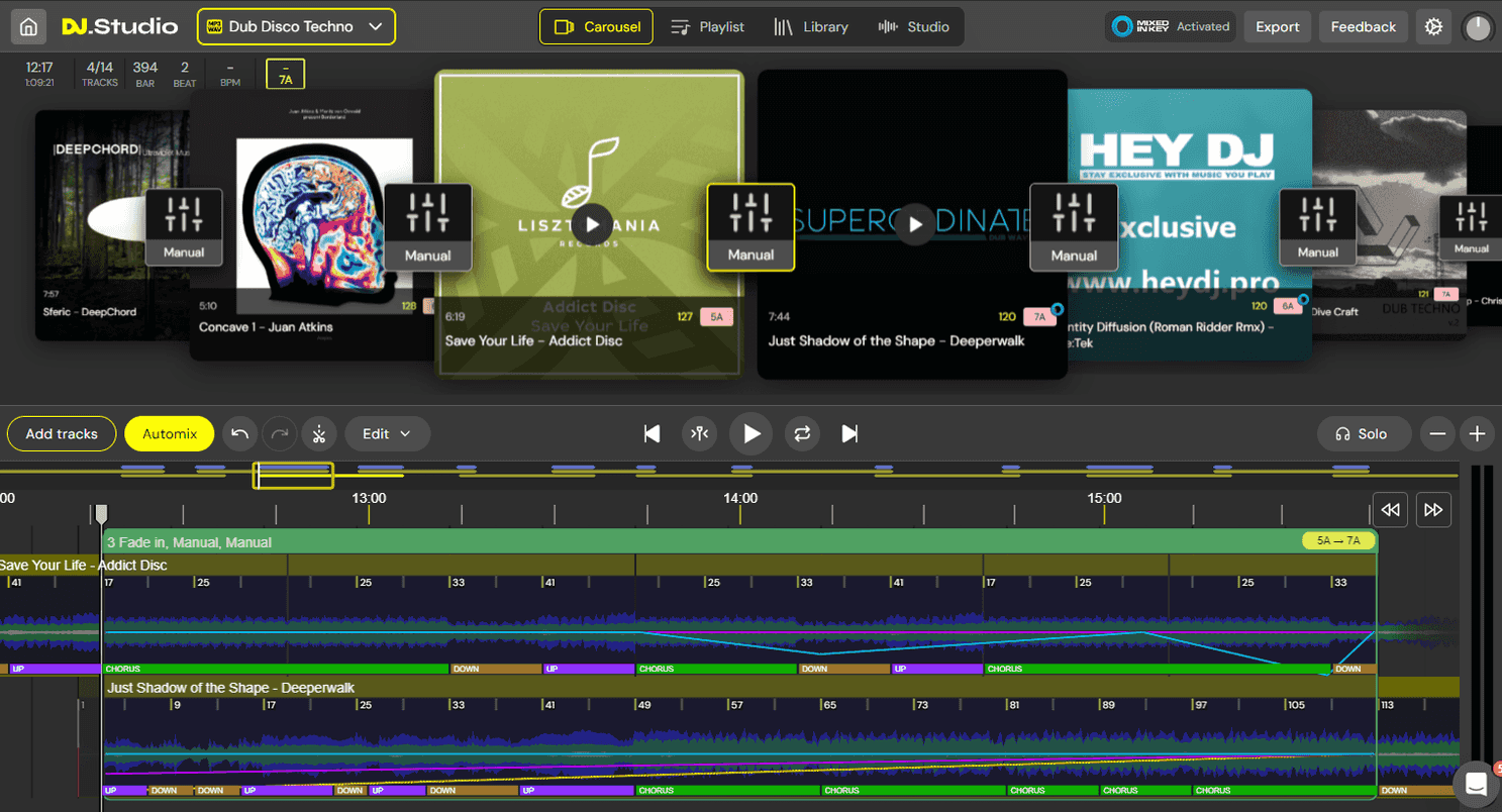 Instead, DJ.Studio boasts an interface reminiscent of a music production Digital Audio Workstation (DAW) or an audio editor. It centers around a timeline and incorporates other intelligent features.