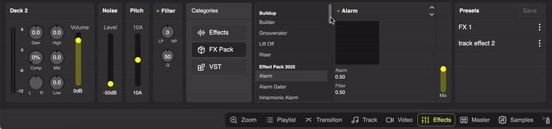 DJ.Studio's FX pack has tools that give your mixes more energy and make them sound more professional. You’ve got filters, reverb, delay, and EQ transitions that are easy to automate along the timeline.