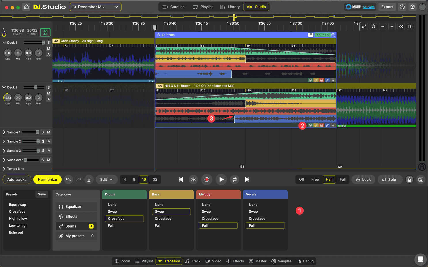 One of DJ.Studio’s most creative tool is stem separation. This lets you isolate vocals, drums, bass, and melody from any track in your mix. You can use it to remove clashing elements during transitions, build custom edits, or create mashups directly in the timeline.