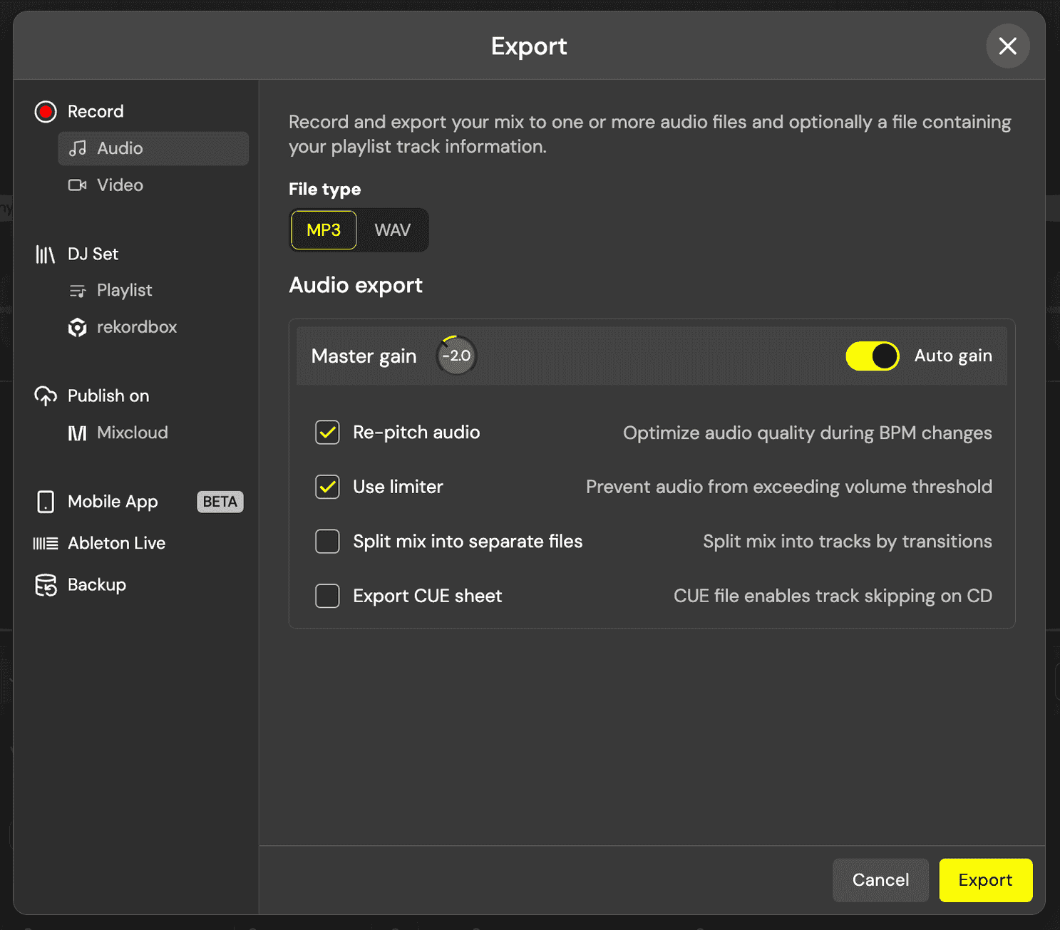Once your mix is complete, DJ.Studio makes it easy to export and share in multiple formats.